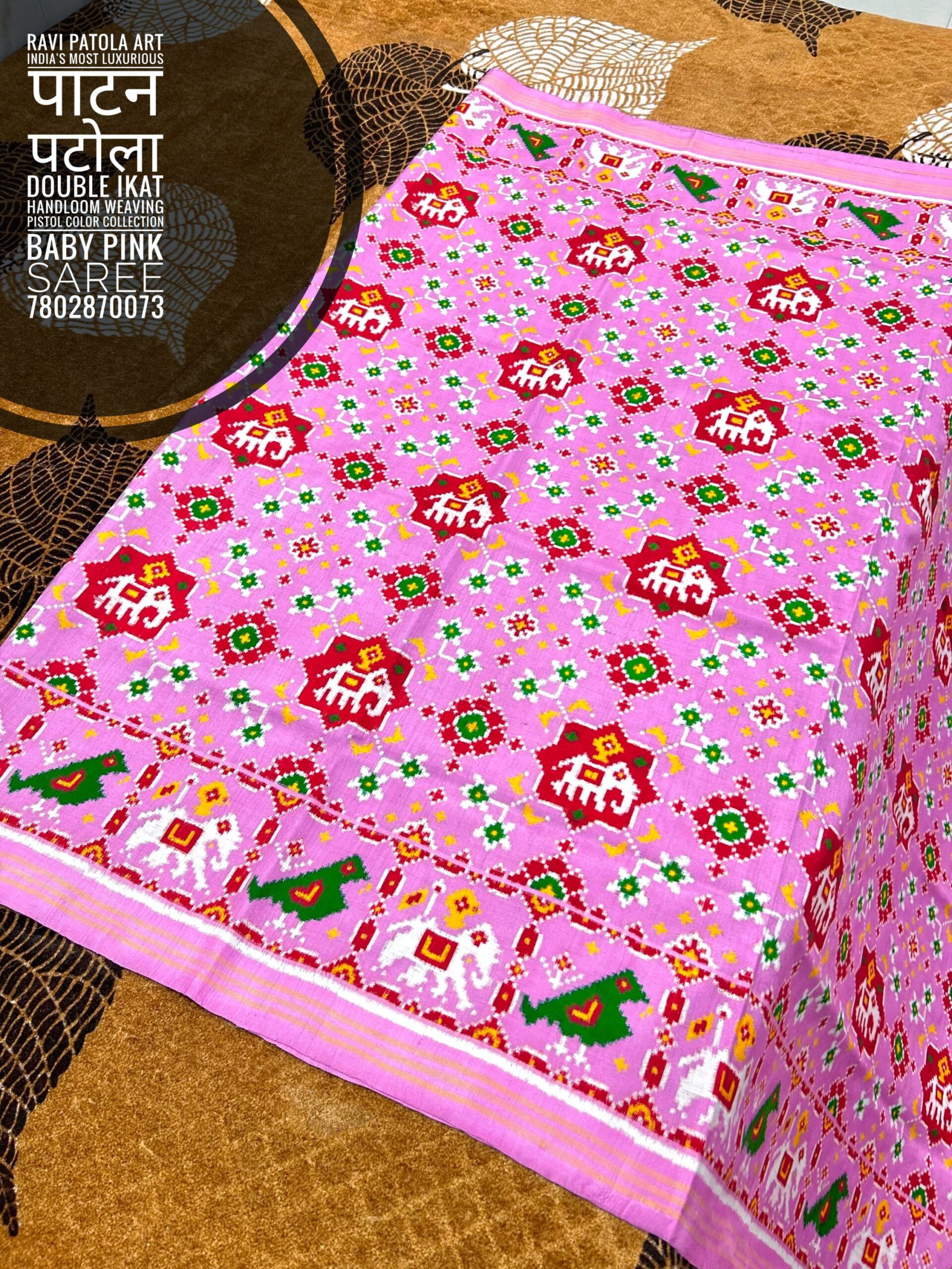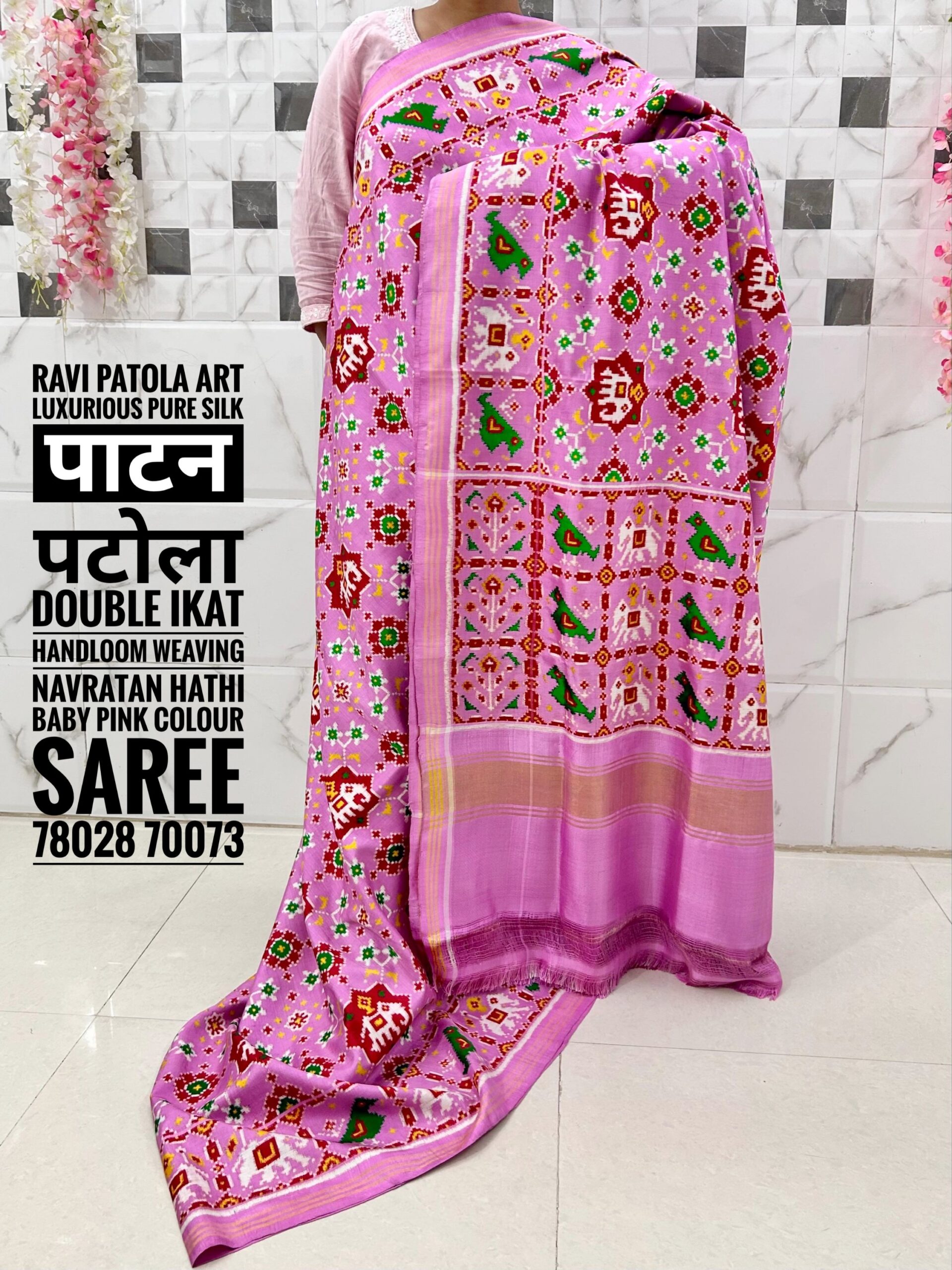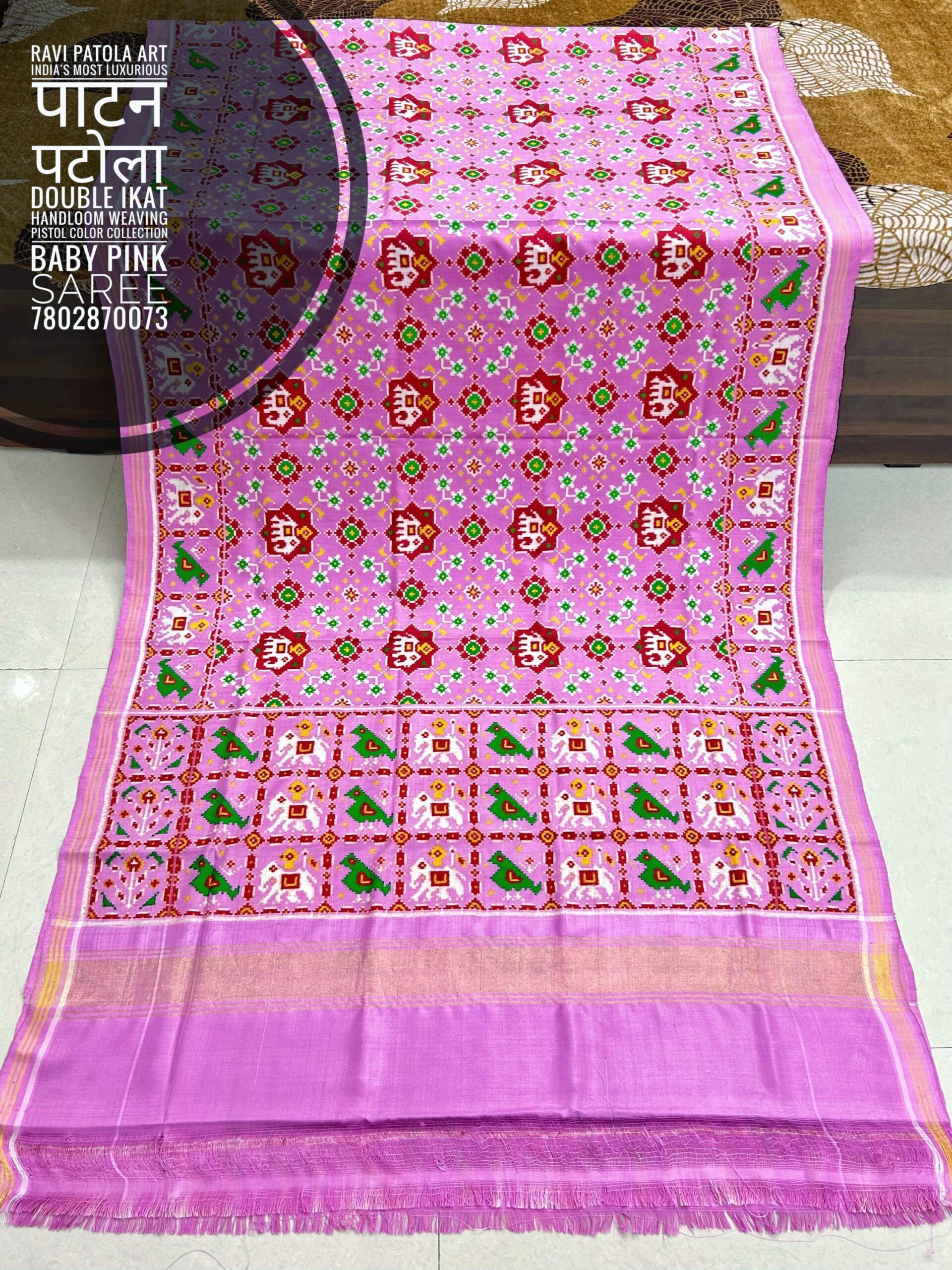 Drape yourself in centuries of tradition with this exquisite Baby Pink Double Ikat Patan Patola Saree. Woven with absolute precision, this isn’t just a garment—it’s a piece of “woven gold” that carries the soul of Patan’s legendary craftsmanship.